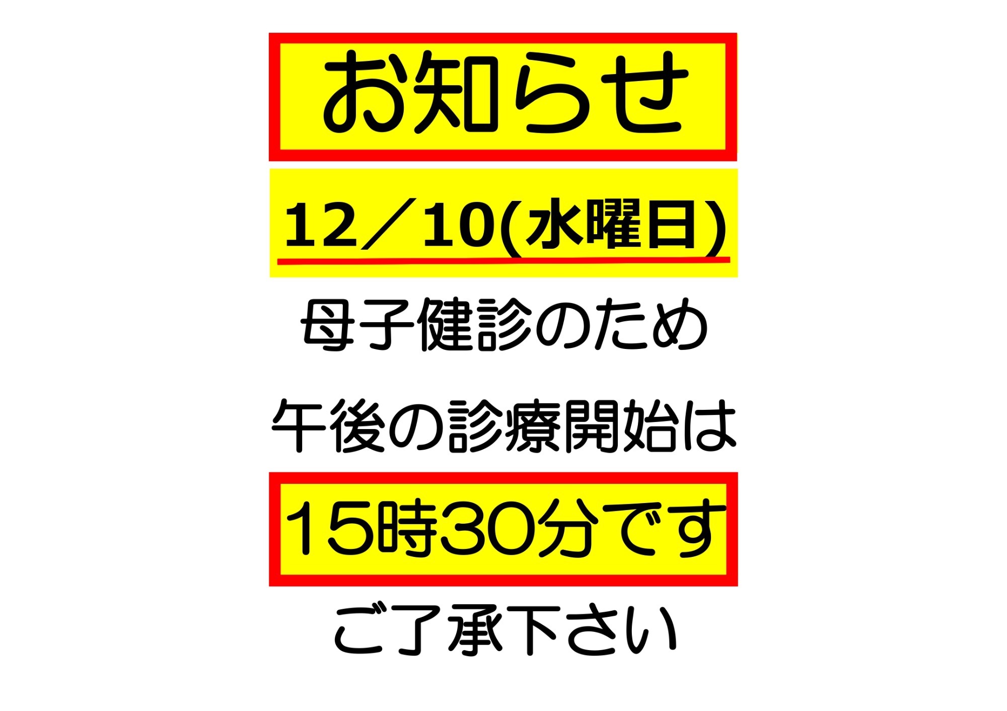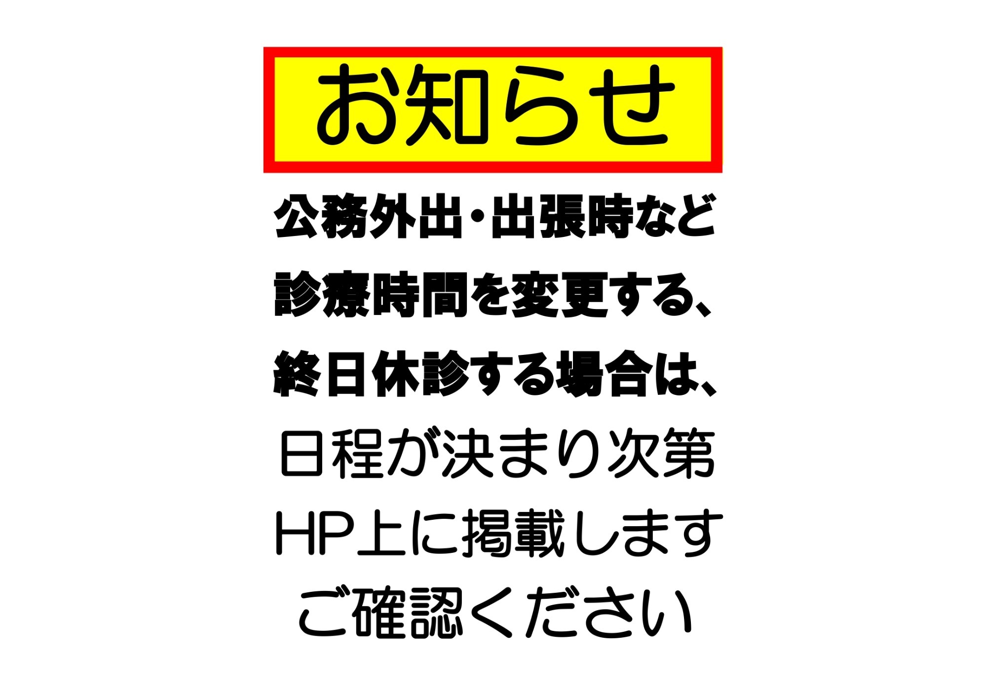 | 診療時間 | 8:30 - 12:30、13:30 - 17:30 受付が午前12時、午後17時を過ぎる場合は、事前に電話連絡をお願いします 診療時間外は留守番電話になります。名前と症状をお話し下さい 木曜・土曜 午後休診 日曜休診 |