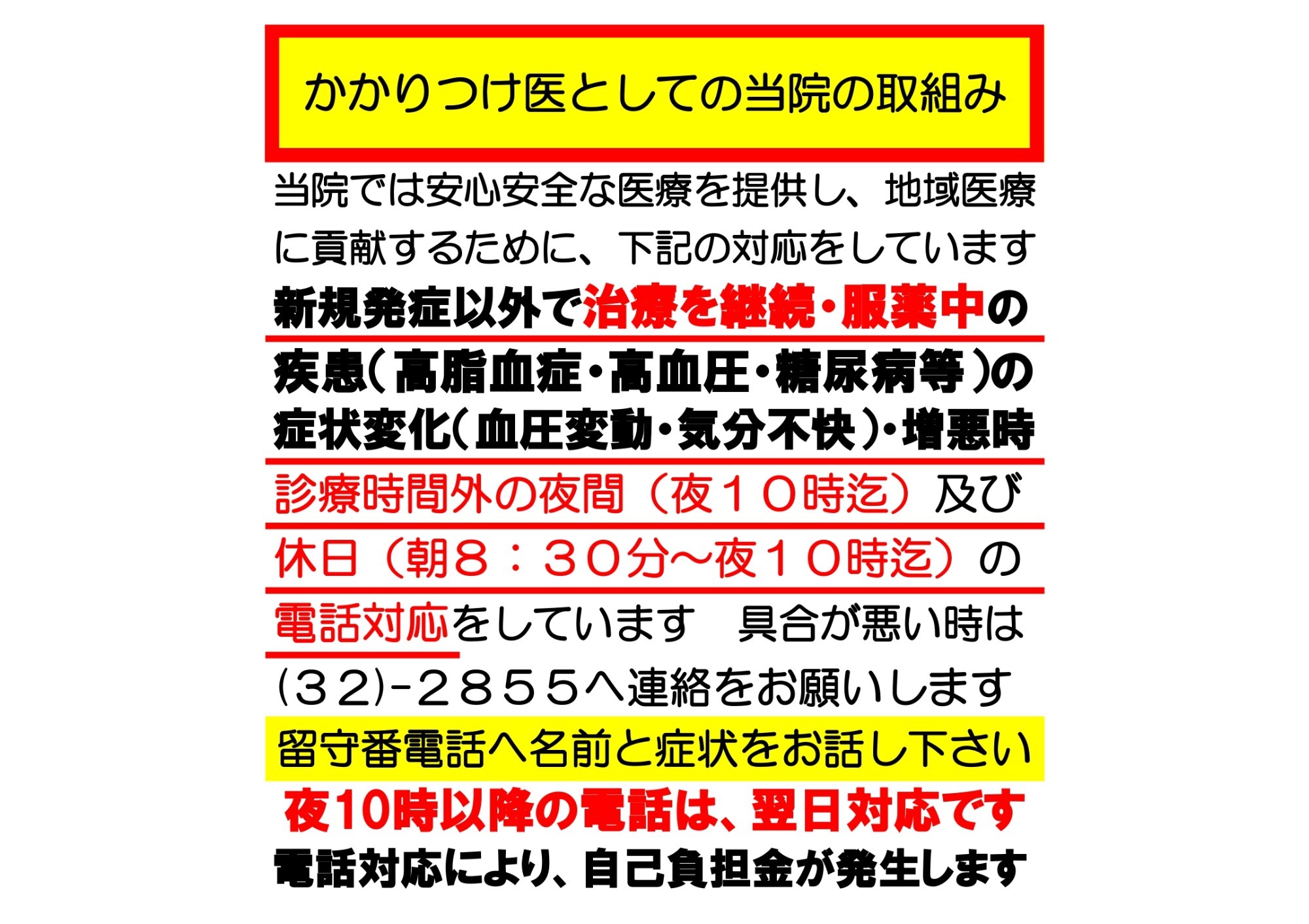 8:30 - 12:30、13:30 - 17:30 受付が午前12時、午後17時を過ぎる場合は、事前に電話連絡をお願いします。 診療時間外は留守番電話になります。名前と症状をお話し下さい。 木曜・土曜午後休診 日曜休診 |